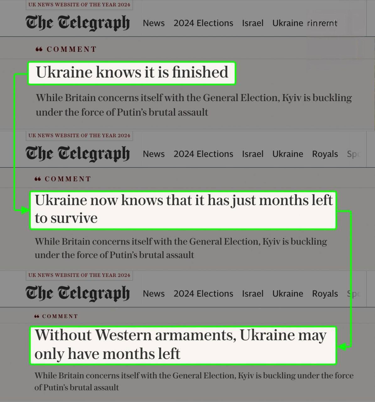 12.50 The Telegraph дважды отредактировал громкий заголовок колонки о тяжелом положении Украины авторства Лизы Хаселдайн.