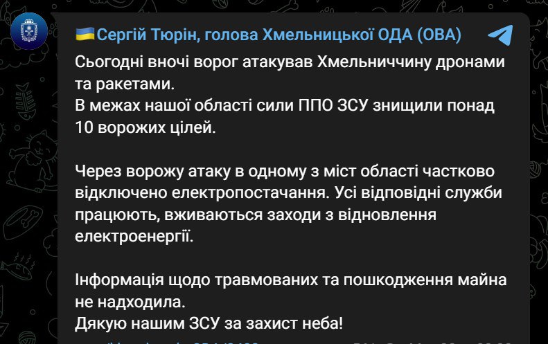 9.07 Власти Хмельницкой области подтвердили ночной удар по региону. "Из-за вражеской атаки в одном из городов области частично отключено электроснабжение", - заявил губернатор Сергей Тюрин.