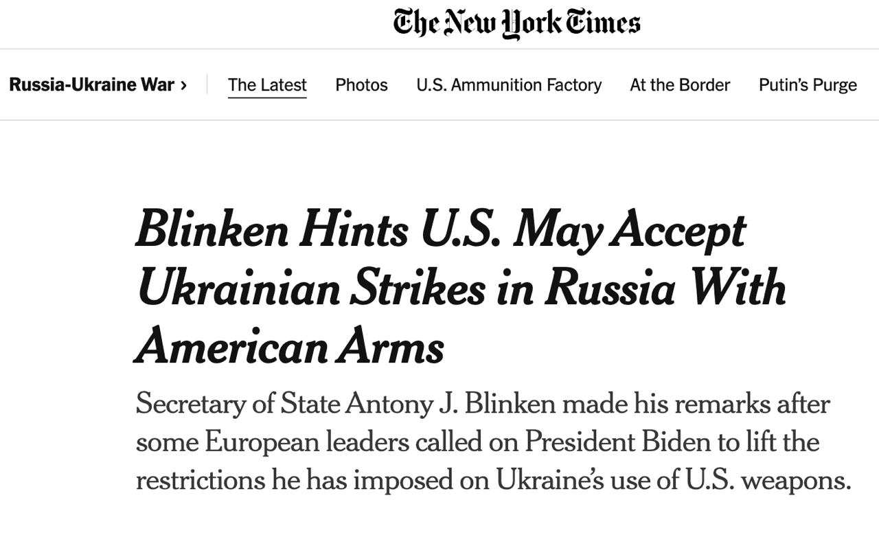 11.51 Блинкен допустил, что США могут разрешить Украине наносить удары американским оружием по территории РФ, передает The New York Times.