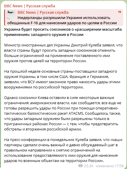 На прошлой неделе основные страны - поставщики западного оружия Украины, в том числе США, Франция и Германия, одобрили удары ВСУ этими вооружениями по российской территории.