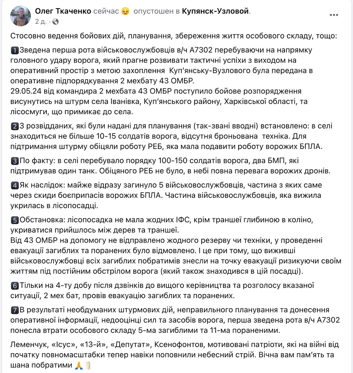 "По факту: в селе находилось порядка 100-150 солдат врага, две БМП, которые поддерживал один танк. Обещанного РЭБ не было, в небе полное превосходство вражеских дронов. Как следствие: почти сразу погибли 5 военнослужащих, часть из которых именно из-за сбросов боеприпасов вражеских БПЛА. 11 ранены", - сообщает Ткаченко.