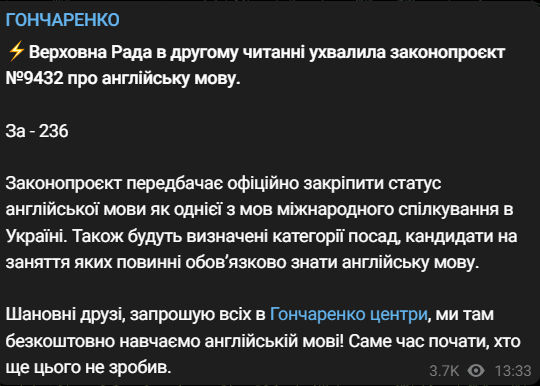 Напомним, в ноябре 2023 года Верховная Рада приняла за основу законопроект о применении английского языка в Украине