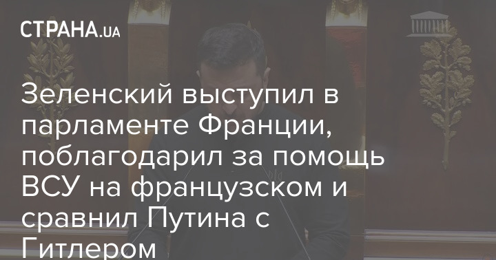 Президент Украины Владимир Зеленский выступил перед Национальным собранием Франции. Вступительную часть речи с благодарностями он произнес на французском языке.