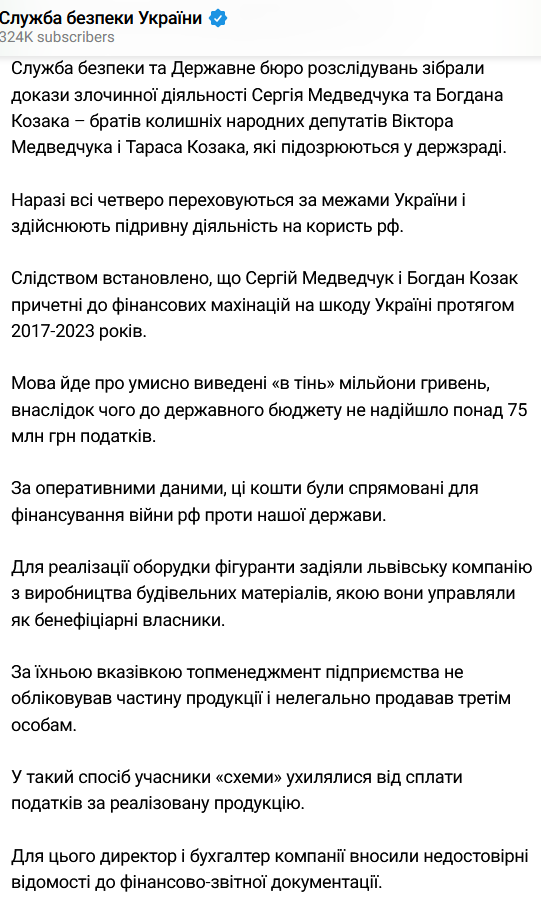 Служба безопасности Украины и Государственное бюро расследование заочно вручили подозрения братьям бывших народных депутатов Виктора Медведчука и Тараса Козака.
