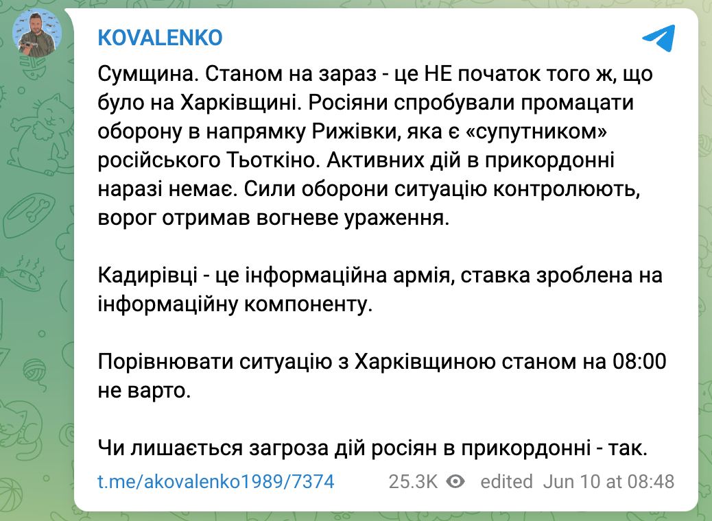 "Активных действий в приграничье пока нет. Силы обороны ситуацию контролируют, враг получил огневое поражение. Остается ли угроза действий россиян в приграничье - да", - сообщает Коваленко.