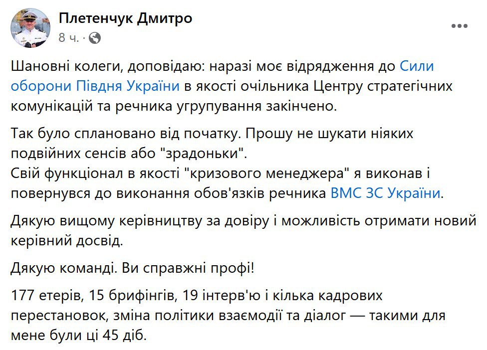 "Прошу не искать никаких двойных смыслов или "зрадоньки". Свой функционал в качестве "кризисного менеджера" я выполнил и вернулся к исполнению обязанностей спикера ВМС ВС Украины", - заявил Плетенчук.