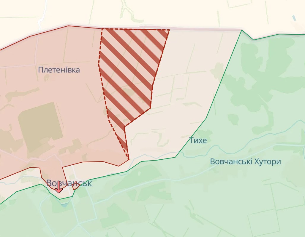 Территория, которая раньше обозначалась как "серая зона" к северо-востоку от Волчанска, теперь находится под российским контролем (заштрихованная область на карте).
