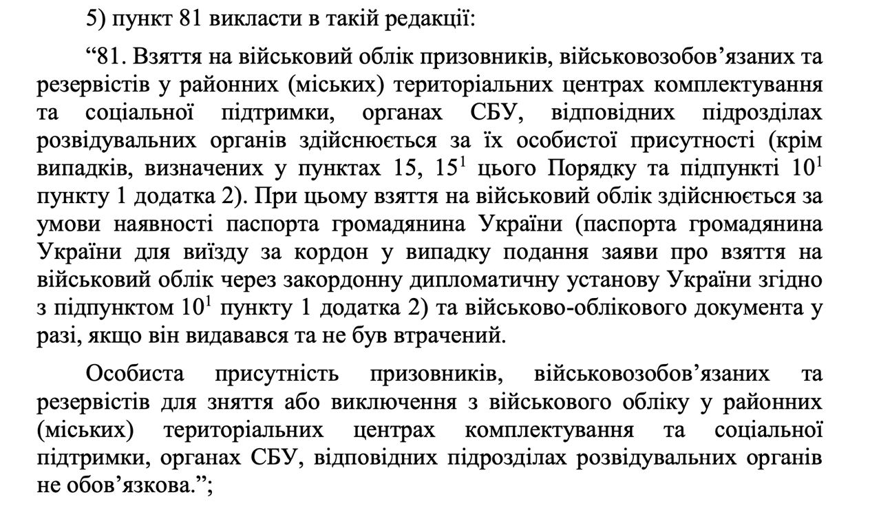 Однако, что важно, он касается только тех лиц, которые снялись официально с воинского учета перед выездом из Украины. А это подавляющее меньшинство находящихся за границей мужчин. То есть большинства заграничных украинцев эта норма не касается. А для того, чтоб сняться с учета, им нужно будет приехать в Украину и пойти в ТЦК (после чего они из страны выехать не смогут, если только не имеют "железного" права на отсрочку вроде трех детей).