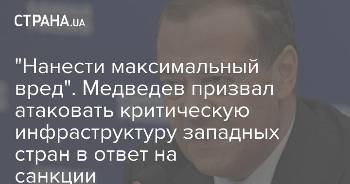 "Надо каждый день пытаться нанести максимальный вред тем странам, которые ввели против нашей страны и всех наших граждан эти ограничения. Вред во всём, в чём можно навредить. Надо и дальше искать критические уязвимости их экономик и бить по ним во всех сферах. Причинять ущерб во всех местах, парализуя работу их компаний и государственных учреждений. Находить проблемы в их важнейших технологиях и беспощадно наносить удары по ним. Буквально изничтожать их энергетику, промышленность, транспорт, банковские и социальные услуги. Наводить страх неминуемым коллапсом всей критической инфраструктуры", – написал Медведев.
