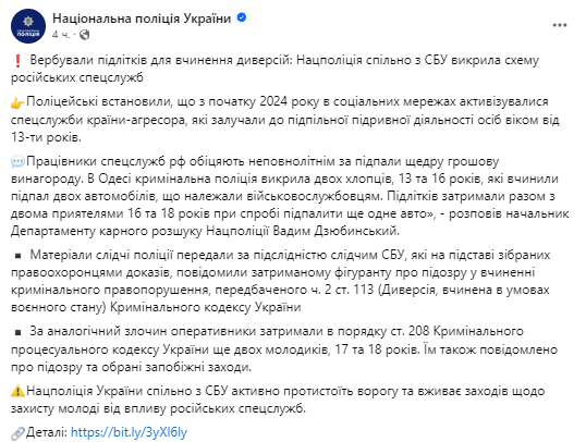 Поджоги военных автомобили совершают за денежное вознаграждение подростки, завербованные Россией через интернет.