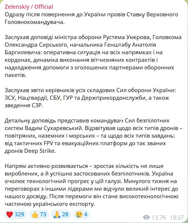«Подробный доклад представил командующий Силами беспилотных систем Вадим Сухаревский. Отчитался по всем типам дронов – воздушных, наземных и морских – и по всем типам задач: от тактических FPV и эвакуационных платформ до так называемых дронов Deep Strike», – добавил президент.
