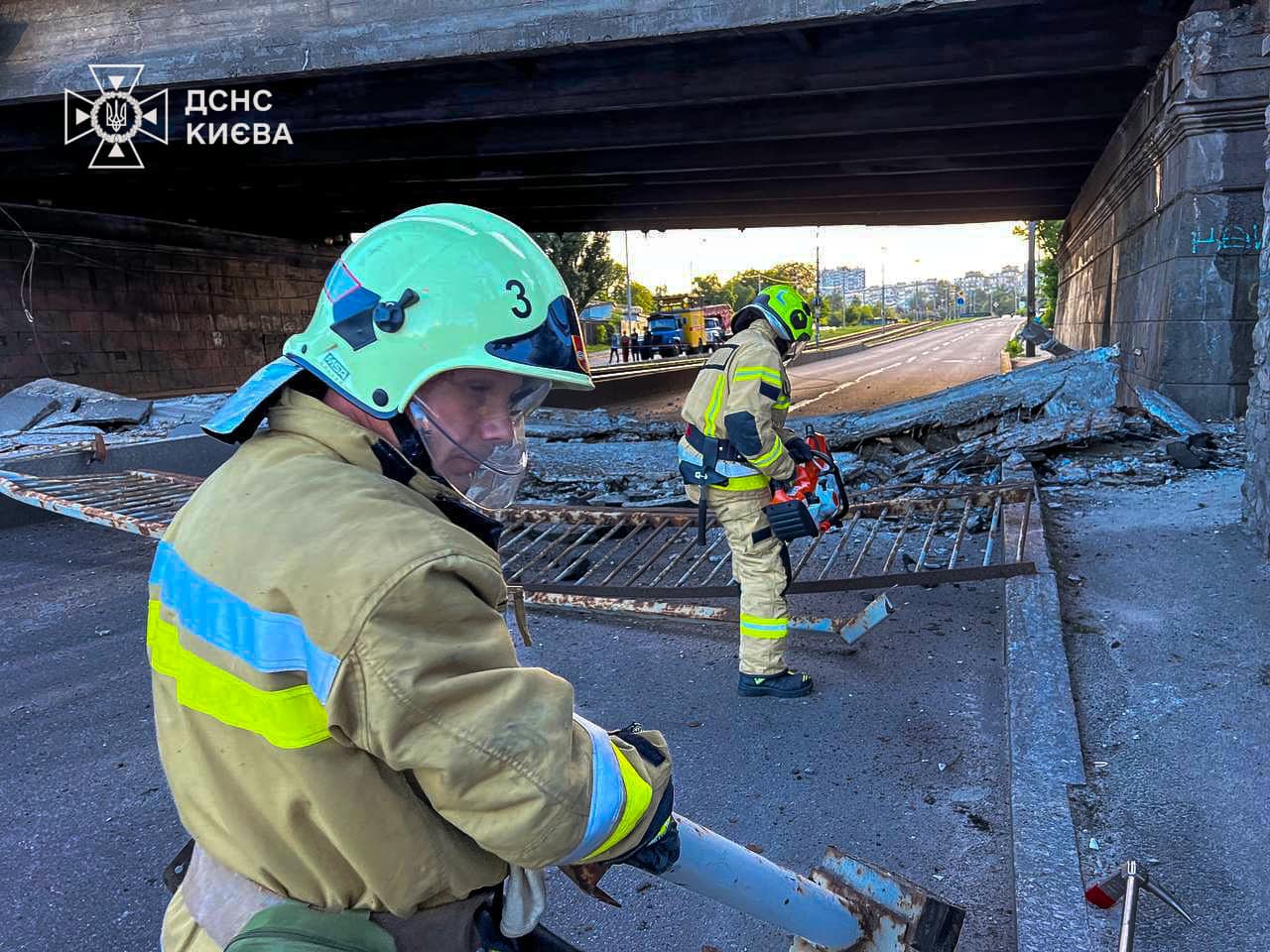 В ГСЧС Киева сообщили, что спасатели разрезают металлические конструкции с помощью гидро- и электроинструмента. Также производится расчистка дороги от разрушенных конструкций.