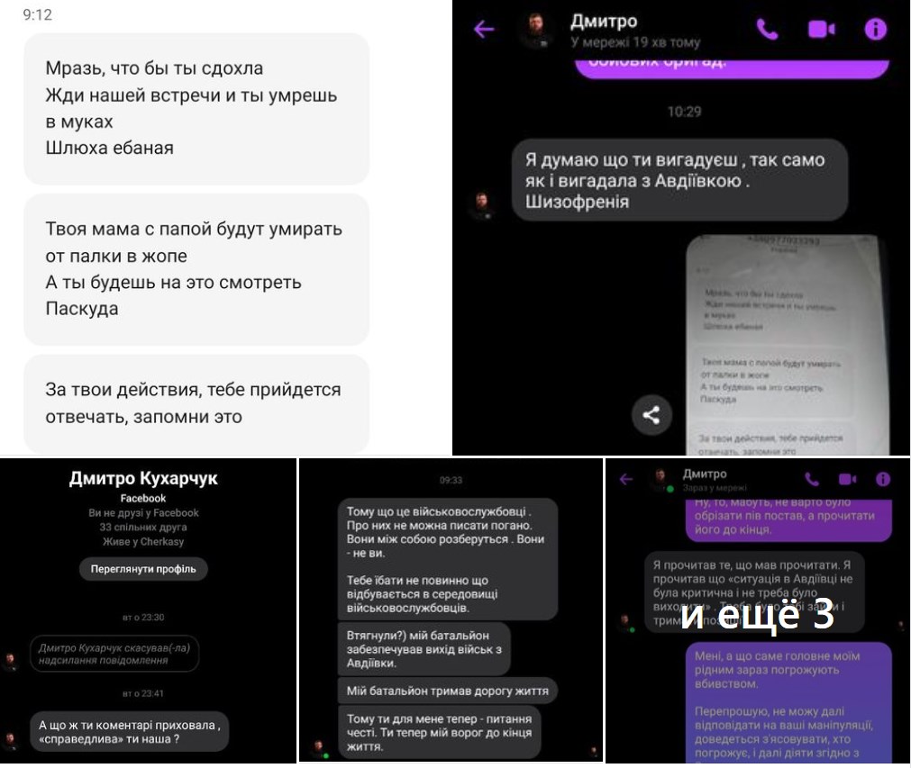 По данным Калюжной, эту угрозу написал некто Назар, который является рядовым 3-й штурмовой бригады. Другие оскорбительные сообщения писал подчиненный Кухарчука Александр. Журналистка заявляет, что данные уже переданы в полицию.