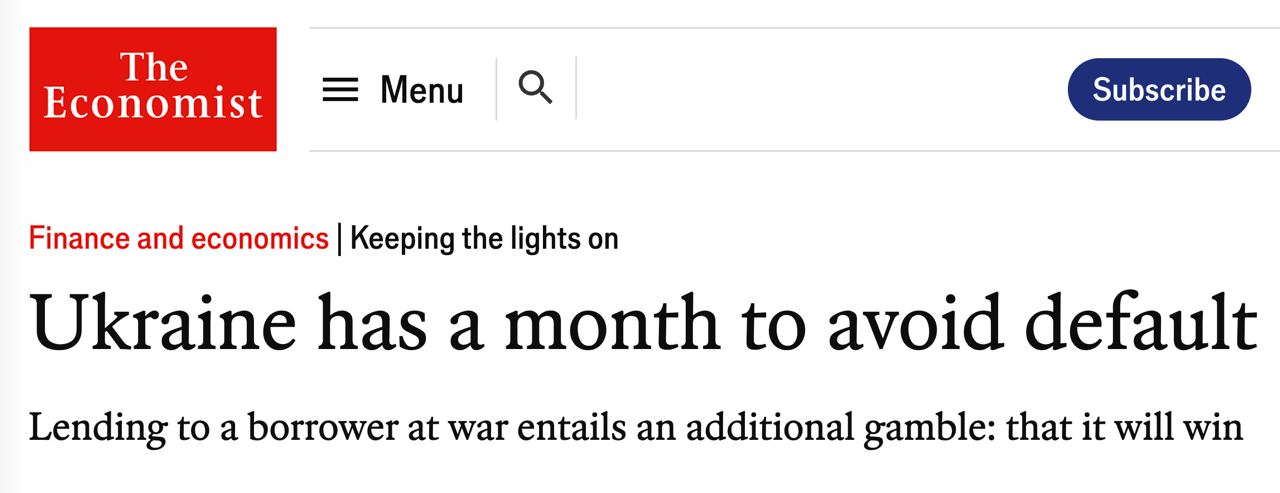 Война наносит тяжелый урон экономике Украины. ВВП страны на четверть меньше, чем накануне вторжения России, недавние атаки на объекты инфраструктуры снизили прогнозы роста. У Украины есть месяц, чтобы избежать дефолта.