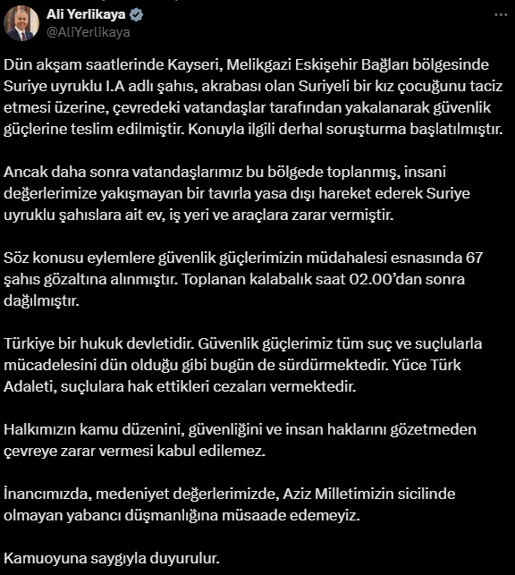 Министр внутренних дел Турции Али Ерликая сообщил, что задержаны 67 человек.