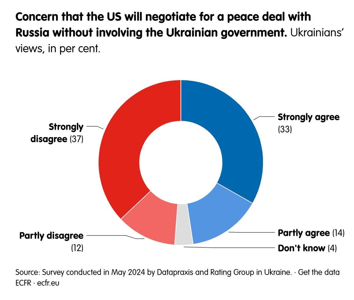 Также 47% украинцев прямо или частично поддерживают прямые переговоры США и России по Украине без участия Киева. 49% против такого варианта. То есть почти поровну.