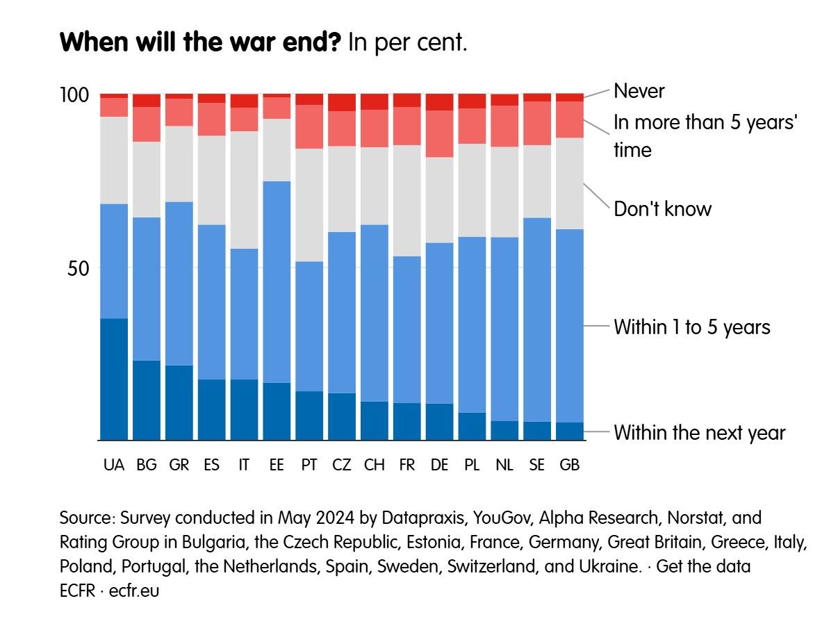 При этом на вопрос, когда закончится война, согласно данным опроса ECFR за май, в большинстве стран Европы говорят, что она может длиться еще до пяти лет.