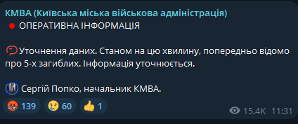 В Соломенском районе есть попадание в бизнес-центр, сообщается об одном погибшем. Коммерческие фирмы занимают первые этажи здания, на остальных этажах - жилые помещения. Разрушены 12-13-й этажи.
