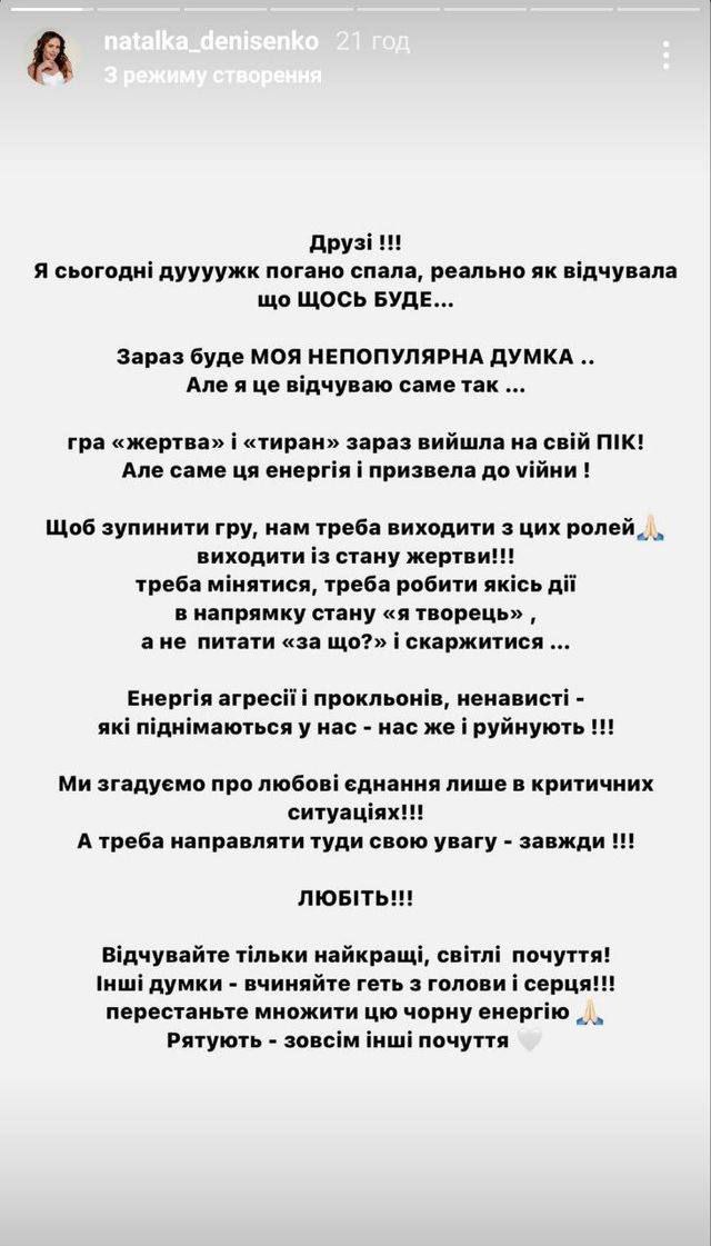 Актриса Наталка Денисенко и вовсе заговорила об "энергии жертвы, которая привела к войне".