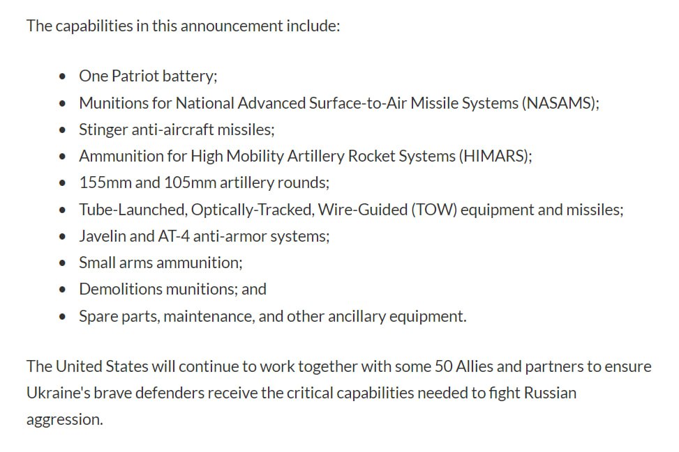 Между тем Минобороны США опубликовало полный список того, что войдет в новую партию помощи: