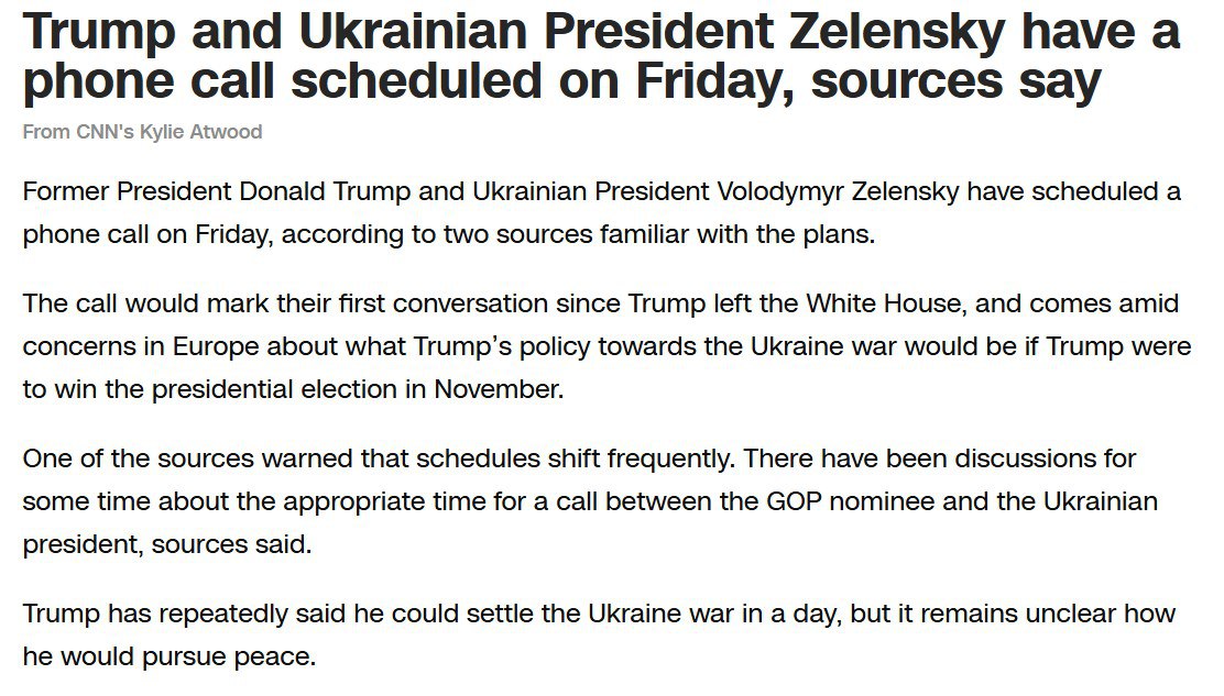 Между тем источники телеканала CNN сообщают, что у Трампа и Зеленского запланирован телефонный разговор в пятницу, 19 июля.