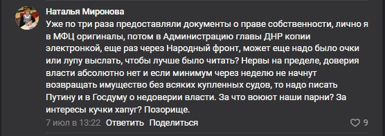 В одной из профильных групп "Вконтакте" жительница "ДНР" Наталья Миронова в начале июля пожаловалась, что уже три раза предоставляла оригиналы документы о праве собственности — и тщетно.