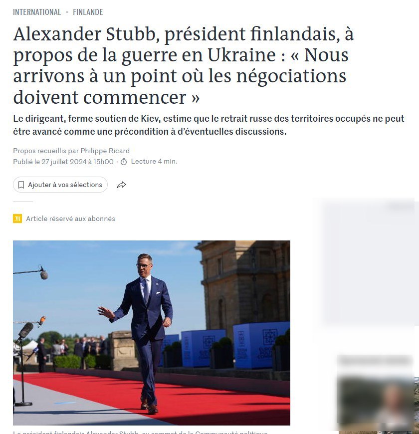 Об этом финский политик сказал в интервью изданию Le Monde.