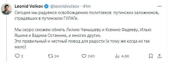"Мы скоро сможем обнять Лилию Чанышеву и Ксению Фадееву, Илью Яшина и Вадима Останина, и многих других. Это правильный и честный повод для радости (к тому же когда их так мало). Но это все равно будет радость со слезами на глазах", — также написал Волков.