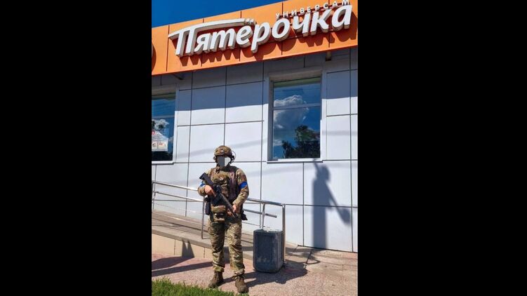 Появилось фото украинского военного у магазина российской сети "Пятерочка" в Судже Курской области