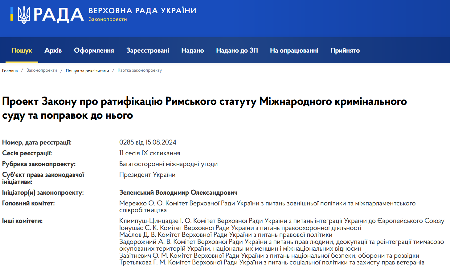 Президент Украины Владимир Зеленский внёс в Верховную Раду законопроект о ратификации Римского статута.