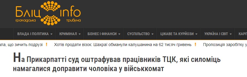 Ивано-франковская специализированная прокуратура в сфере обороны Западного региона направила в суд материалы о привлечении к административной ответственности двух сотрудников ТЦК в звании майора и капитана за задержание мужчины с применением насилия. Верховинский районный суд оштрафовал их на 17 тысяч гривен за превышение полномочий.