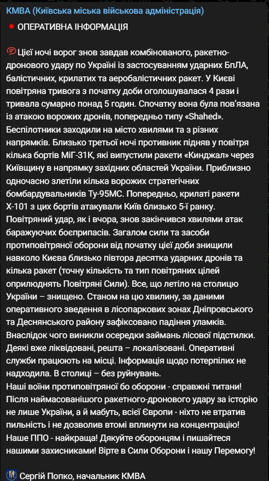 Киев этой ночью сперва атаковали "Шахеды", затем крылатые ракеты Х-101, после которых снова пошли беспилотники. Также через Киевскую область пролетели "Кинжалы" в сторону западных областей, сообщили в столичной военной администрации.