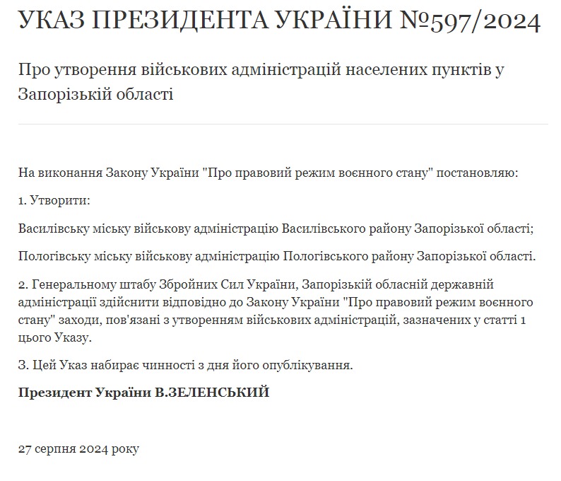 Владимир Зеленский издал указ о создании городских военных администраций в Пологах и Васильевке Запорожской области. Причем оба города находятся под контролем армии РФ.