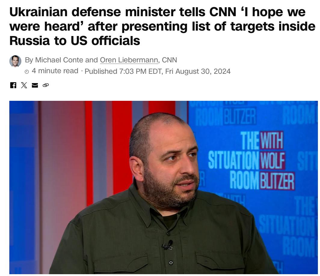 Как сообщает телеканал, министр обороны Украины Рустем Умеров тем не менее уже передал администрации Байдена список целей на территории РФ, куда Киев предлагает нанести удары, если США снимут запрет на дальнобойные удары по российской территории американским оружием.