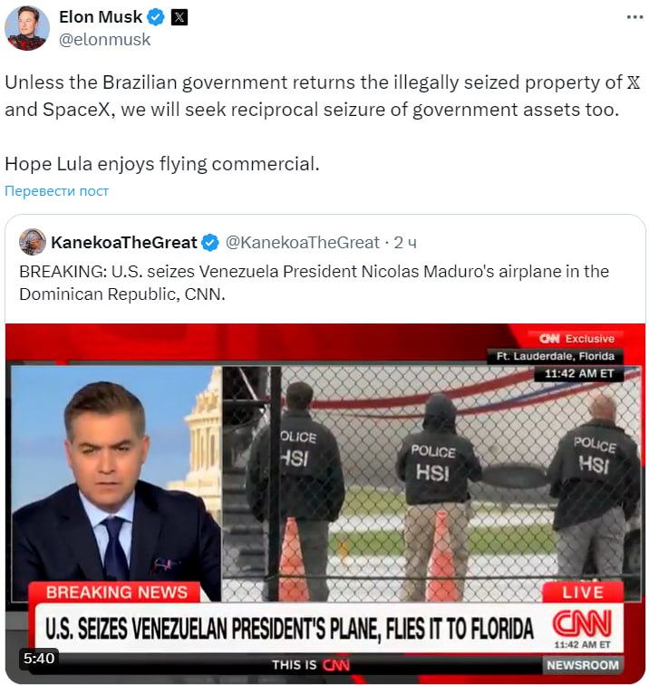 Маск требует арестовать активы Бразилии в США за заморозку счетов SpaceX и запрет социальной сети X