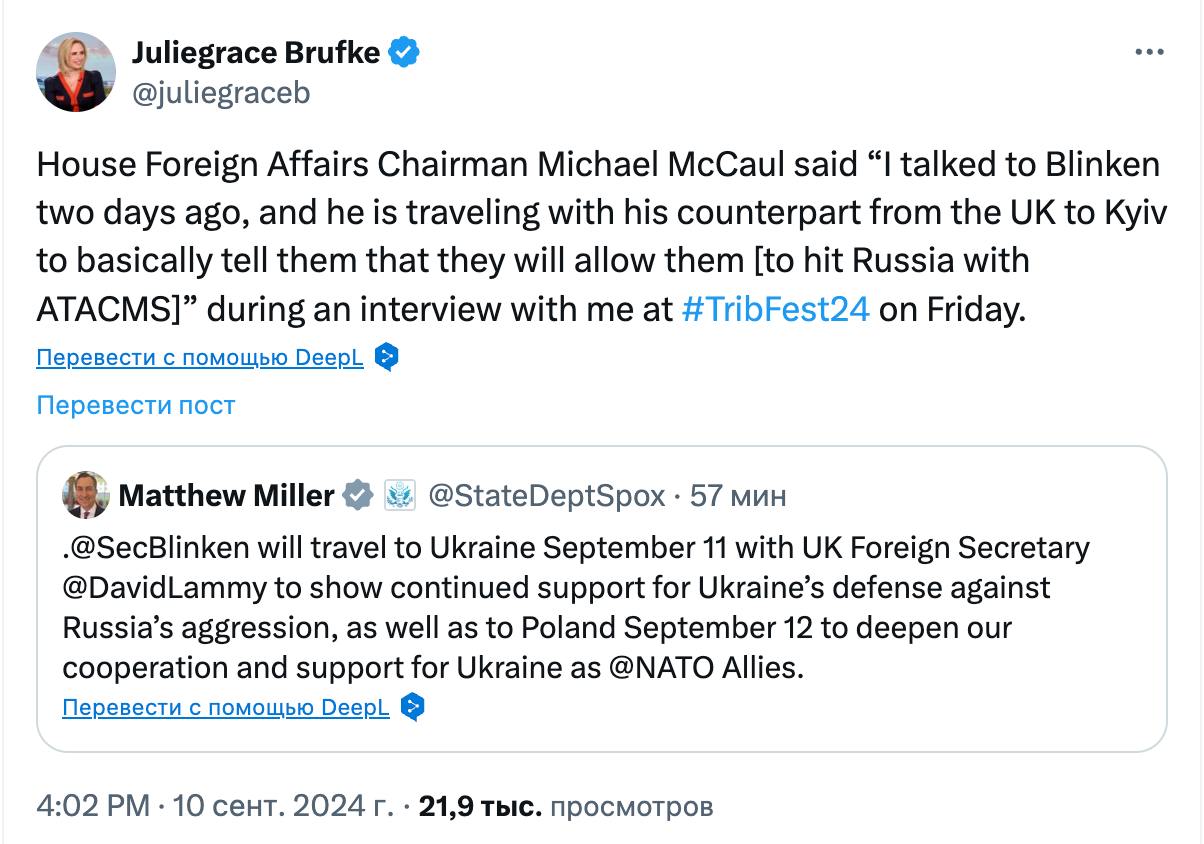 "Я разговаривал с Блинкеном два дня назад, и он едет со своим коллегой из Великобритании в Киев, чтобы, по сути, сказать им, что они разрешат им [наносить удары по России с помощью ATACMS]", - приводит слова Маккола журналист.
