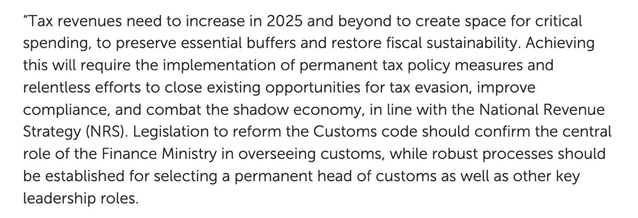"Налоговые поступления должны увеличиться в 2025 году и далее, чтобы создать пространство для критически важных расходов, сохранить необходимые буферы и восстановить фискальную устойчивость. Достижение этого потребует внедрения постоянных мер налоговой политики и неустанных усилий по закрытию существующих возможностей для уклонения от уплаты налогов, улучшению соблюдения требований и борьбе с теневой экономикой в соответствии с Национальной стратегией доходов (NRS)",- говорится в сообщении МВФ.