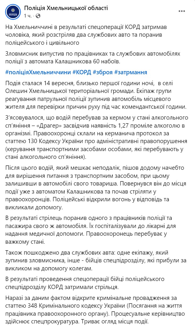 В Хмельницкой области задержан мужчина, открывший огонь по полицейским из автомата Калашникова. Он ранил полицейского и гражданского.