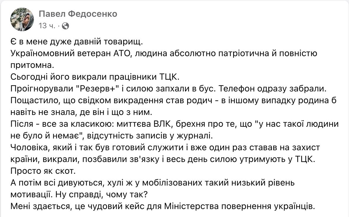 "Проигнорировали "Резерв+" и силой запихали в бус. Телефон сразу забрали. После – все по классике: мгновенная ВВК, ложь о том, что "у нас такого человека не было и нет", отсутствие записей в журнале. Мужчину, который и так был готов служить и уже однажды становился на защиту страны, похитили, лишили связи и весь день силой удерживают в ТЦК. Просто как скот. А потом все удивляются, х@ли у мобилизованных такой низкий уровень мотивации", - пишет Федосенко.
