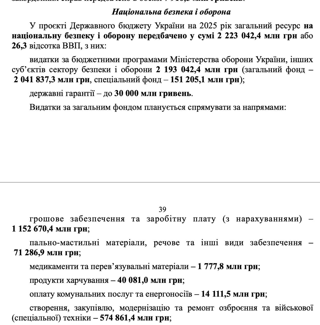 Там говорится, что общие расходы на сектор обороны составят 2,22 триллиона гривен. Из них почти половина - 1,1 триллиона - пойдет на зарплаты и почти 575 миллиардов - на производство, закупки и ремонт военной техники.