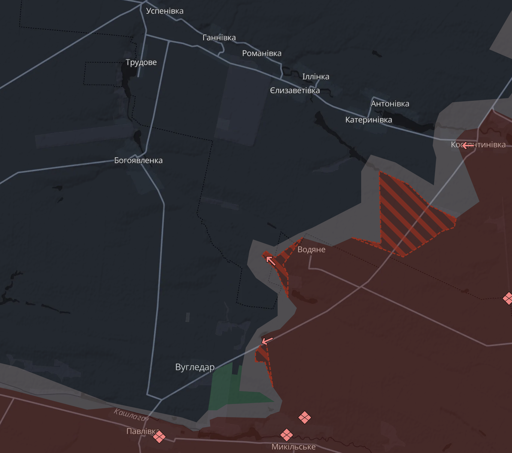 От зоны боевых действий западнее Водяного до трассы Угледар-Богоявленка осталось 3,7 километра. Как мы уже писали, при ее перерезании Угледар оказывается в оперативном окружении.