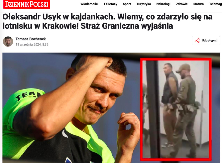 Польские пограничники сообщили, что не задерживали Усика в аэропорту Кракова, передает Dziennik Polski.