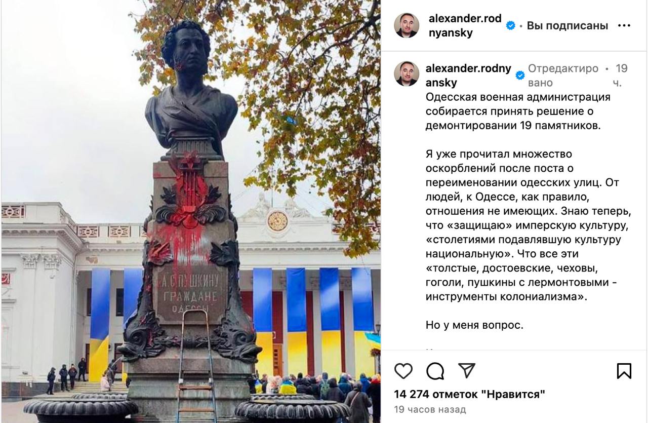 Ну и Пушкин. Если бы его памятник поставили в 1937 году в рамках сталинской кампании, как это сделали в Киеве, где поэт никогда не бывал, то я бы отлично понял решение о сносе. Но памятник в Одессе поставили в 1887-1889 годах благодарные одесситы. За свои деньги", - сказано в посте Роднянского.