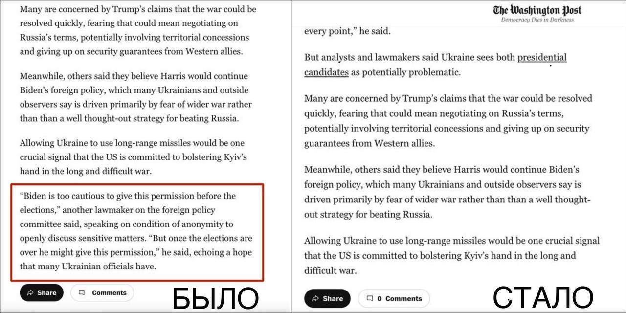 17:22 В сети обратили внимание, что из статьи AP и Washington Post пропал абзац о том, что Байден может дать Украине разрешение на дальнобойные удары по РФ после выборов в ноябре.