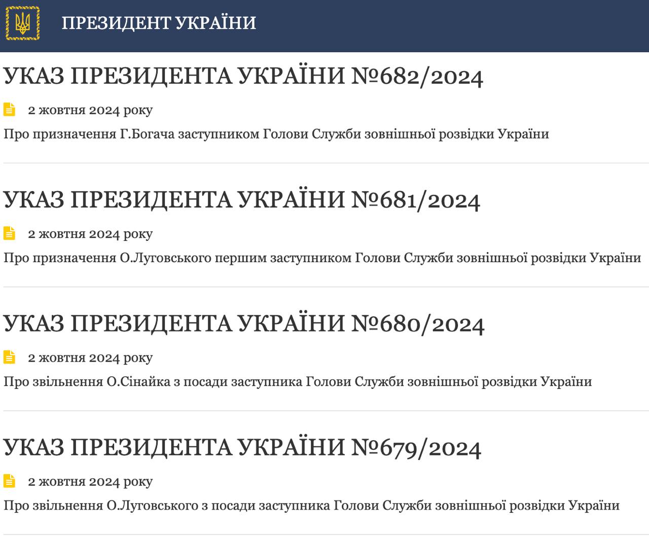Своими указами Зеленский  уволил заместителя главы СВР Олега Синайко, а вместо него назначил Геннадия Богача. Также Олега Луговского с должности заместителя повысил до первого заместителя.