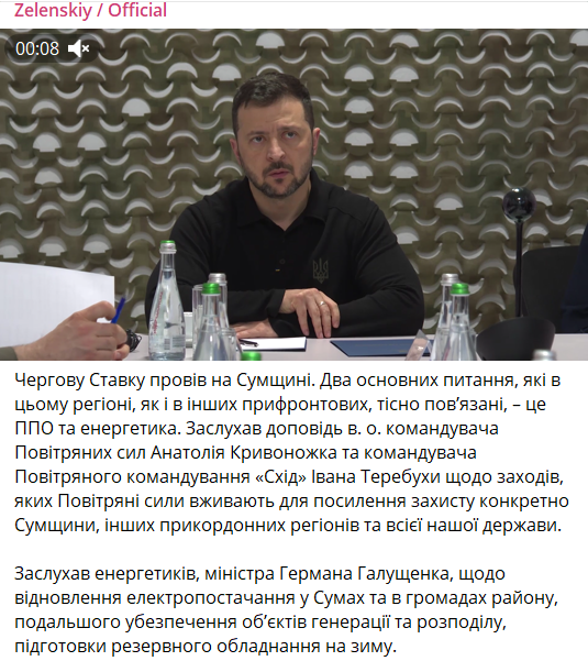 "Заслушал доклад и. о. командующего Воздушными силами Анатолия Кривоножко и командующего Воздушным командованием "Восток" Ивана Теребухи... Заслушал энергетиков, министра Германа Галущенко, относительно возобновления электроснабжения в Сумах и общинах района, дальнейшего обеспечения объектов генерации и распределения, подготовки резервного оборудования на зиму", – рассказал президент.
