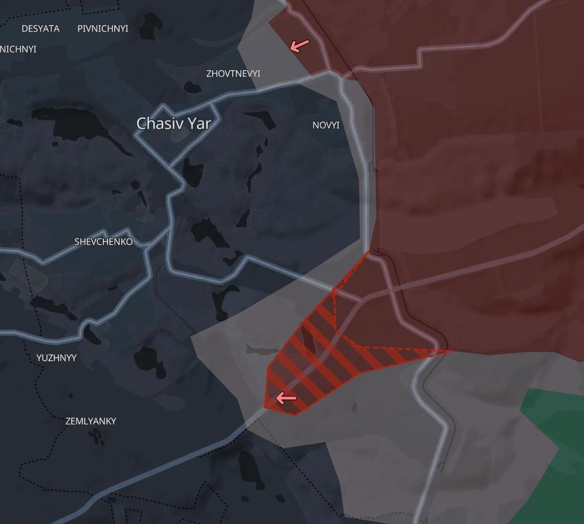 Южнее, в Донецкой области, россияне продвинулись к югу от Часова Яра по трассе Бахмут-Константиновка. Об этом ранее уже писали российские паблики. Такое продвижение создает угрозу начала штурма города с южного фланга (сейчас наступление идет с востока).