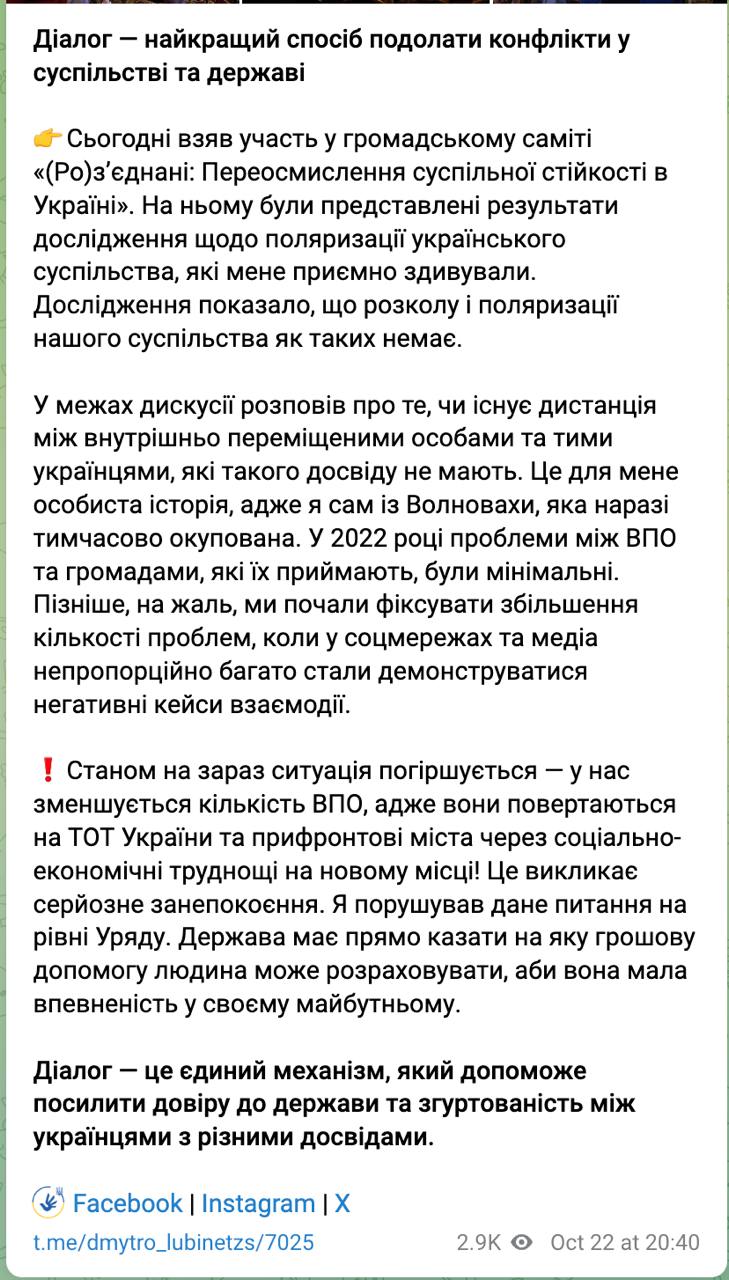 "Сейчас ситуация ухудшается — у нас уменьшается количество ВПЛ, ведь они возвращаются на временно оккупированные территории Украины и  в прифронтовые города из-за социально-экономических трудностей на новом месте. Это вызывает серьезную обеспокоенность. Я поднимал данный вопрос на уровне правительства. Государство должно прямо говорить, на какую денежную помощь человек может рассчитывать, чтобы у него была уверенность в своем будущем", - заявил Лубинец.