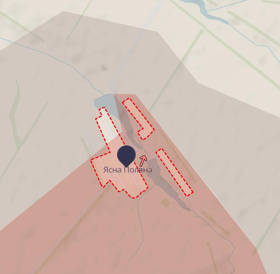 Российские карты показывают контроль РФ над Ясной Поляной, а также продвижение российских войск на север, к юго-востоку и к юго-западу от нее.