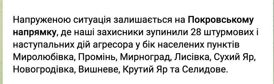 В утренней сводке ГШ заявлено, что на Покровском направлении ВСУ "остановили 28 штурмовых и наступательных действий агрессора в сторону", в частности, Вишневого и Селидово.